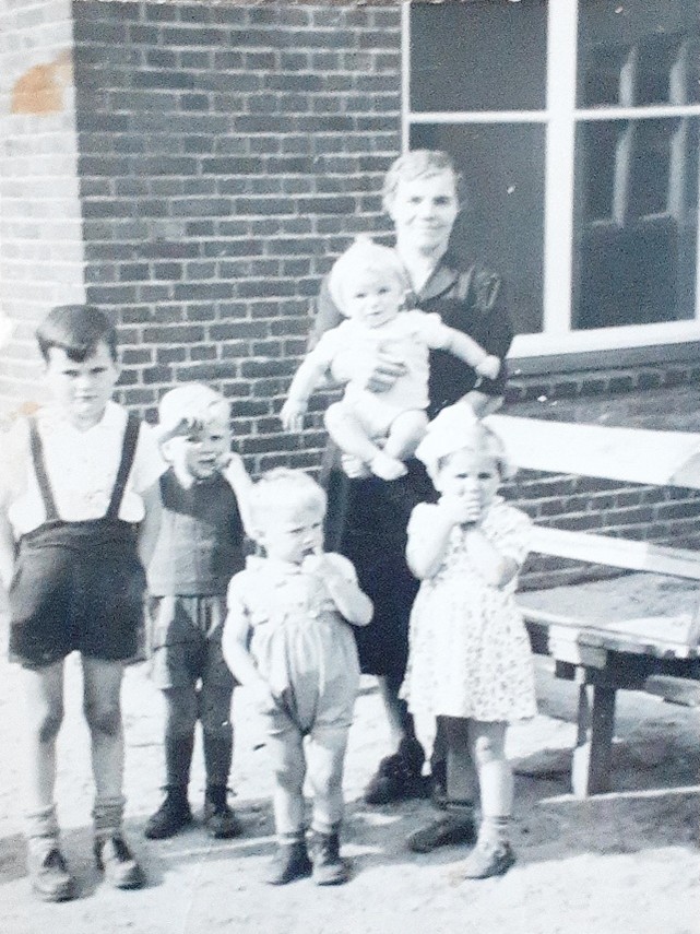 Buurjongen, Ad, André, moeder met Nico en Mia (1952). Foto is genomen op de rechterhoek van de voorbouw, toen dit gedeelte nog niet was gesloopt (uit: familiearchief).