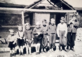 V.l.n.r. kinderen Leijssen: Nico, André, Mia, Ad, Jan, Henk, Kees, Tinie (ongeveer 1955). Foto genomen in de tuin van Molenstraat 12, voor het kippenhok met -ren. De jongste (Peter) was toen nog een baby (uit: familiearchief).