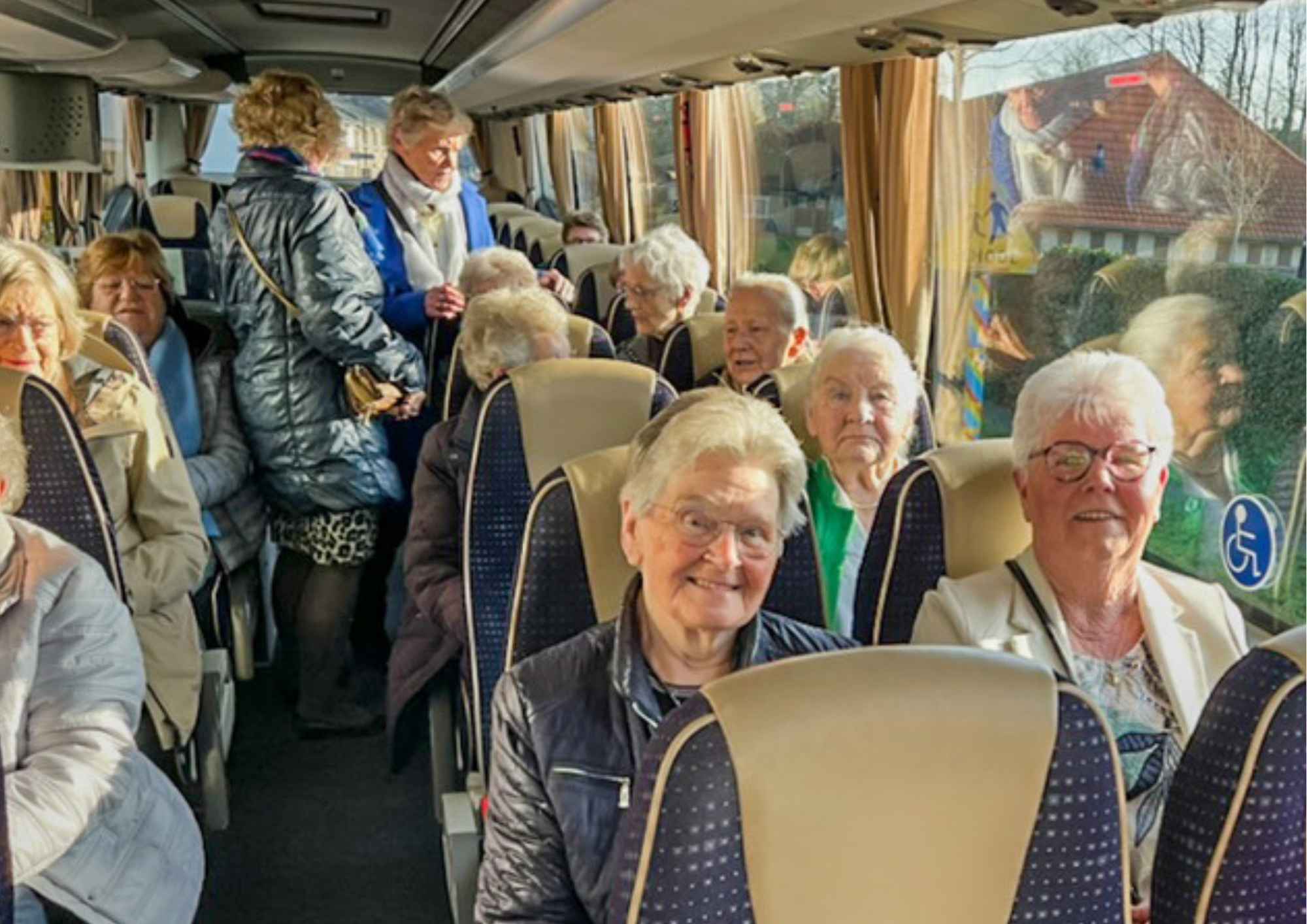 In een voorzichtig voorjaarszonnetje verzamelde de hele groep in opperbeste stemming bij ’t Perron voor dit bijzondere uitje. De Museum Plus Bus is er speciaal op ingericht dat ook passagiers die minder mobiel zijn toch gemakkelijk en comfortabel kunnen reizen.
